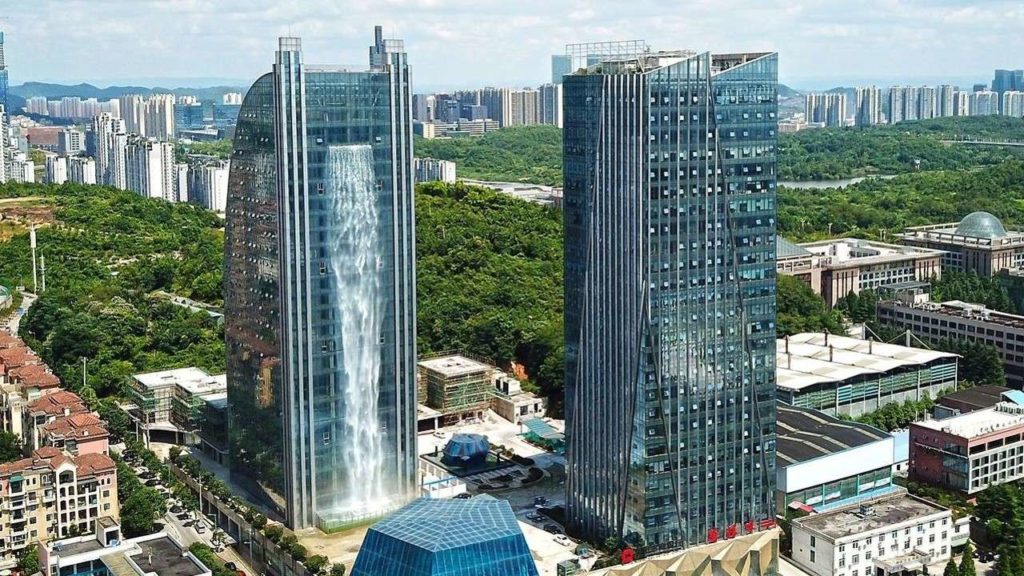 1 The 397-foot tall Liebian Building features a spectacular waterfall, providing a dramatic spectacle from the plaza below. At 350-feet, the waterfall is among the tallest artificial waterfalls in the world—and easily the largest artificial waterfall located in an urban area.