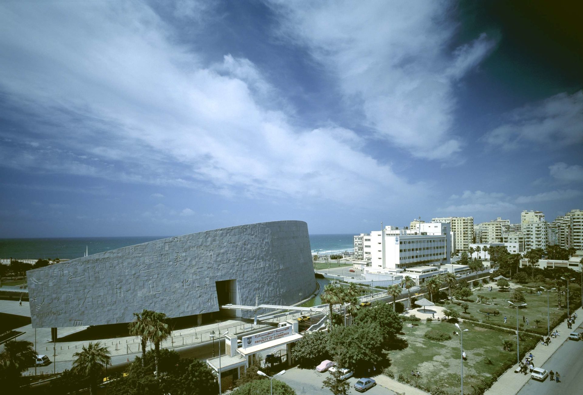 1 The 915,000 square foot Bibliotheca is built on a magnificent site alongside Alexandria’s ancient harbor in the historic center of the city. The 11-story library can contain up to 4 million volumes of books, a figure that can be expanded up to 8 million in the future by the use of compact storage.