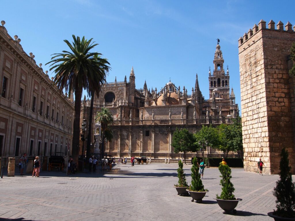 16/ The Cathedral of Saint Mary of the See (a/k/a Seville Cathedral) is a Roman Catholic cathedral in Seville that dates to the 15th century. It adjoins the Alcázar Palace complex and the General Archive of the Indies. It is the fourth-largest church in the world as well as the largest Gothic church.