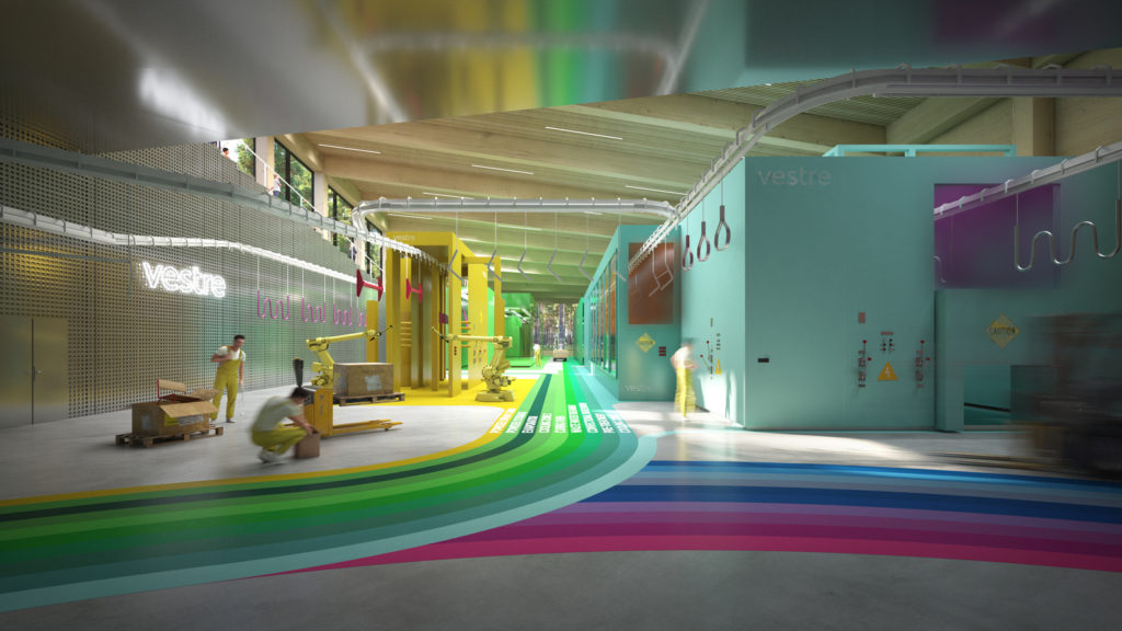 Vibrant and whimsical, the facility is a LEGO–futurist marvel that practically shouts Vestre’s five-point brand manifesto at every turn. Brightly color-coded to elucidate the furniture-building process, the interiors resemble something between a giant subway map and a board game for toddlers. Curious visitors can follow furniture’s progress across the four wings: Wood Factory, Color Factory, Assembly, and Warehouse.