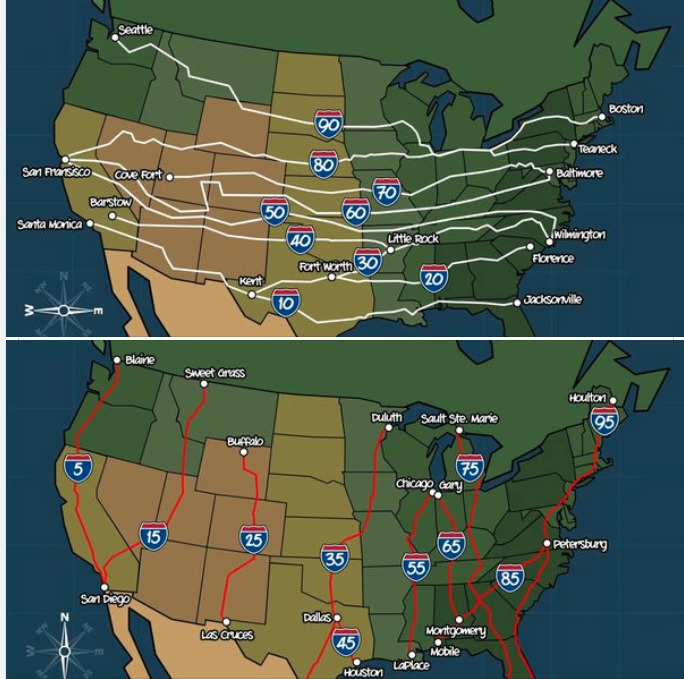 Typically, odd-numbered Interstates run north-south (with lower numbers in the west and higher numbers in the east) Even-numbered Interstates run east-west (with lower numbers in the south and higher numbers in the north). Highways whose route numbers are divisible by 5 usually represent major coast-to-coast or border-to-border routes (ex. I-10 travels from Santa Monica, California, to Jacksonville, Florida).