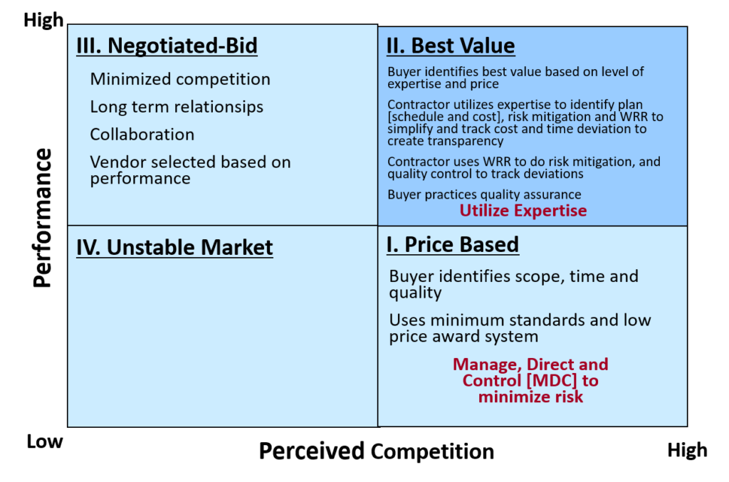 In 1991, Dean Kashiwagi identified that the only difference between high performance and low performance in the construction industry was the ability of construction buyers to utilize the expertise of contractors. From his observations of the industry, he created the industry structure figure to explain the problem. Each of the four quadrants in the industry structure figure explain different environments in the industry. In the Price Based or low bid environment, risk is minimized by management, direction and control (MDC). In the Best Value Environment, risk is minimized by the utilization of expertise. The Best Value Environment is less expensive, transparent and more efficient. It uses the simple approach, hire experts and let them do their job.