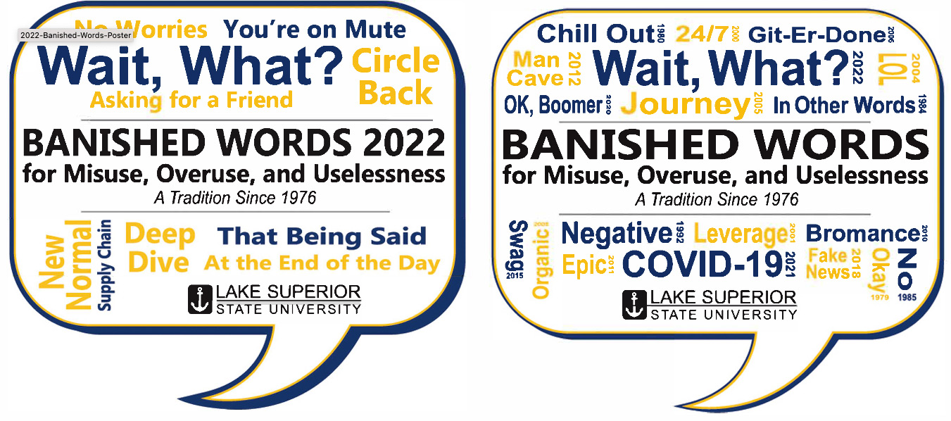 This year, more than 1,000 of the 1,250+nominations of words and terms for banishment for misuse, overuse, and uselessness for 2022 were colloquial. In 2021, seven of the ten words and terms that LSSU banished were about corona virus (see the March-April 2021 edition of the network). This year’s list adds another three. The Banished Words List has become such a cultural phenomenon that comedian George Carlin submitted an entry that made the annals in 1994: “baddaboom, baddabing.”