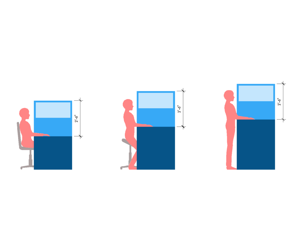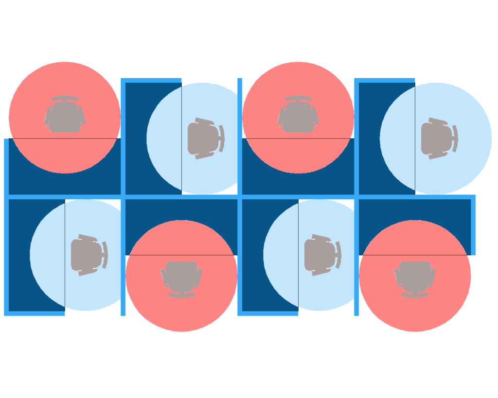 In open work spaces, vertical dividers need to be added between all users, depending on the type of furniture utilized. Panels should accommodate for users at sitting or standing height and should extend a minimum of 30” over the height of the work surface. Each space should also be equipped with its own personal air filtration device and noise-cancellation machine.