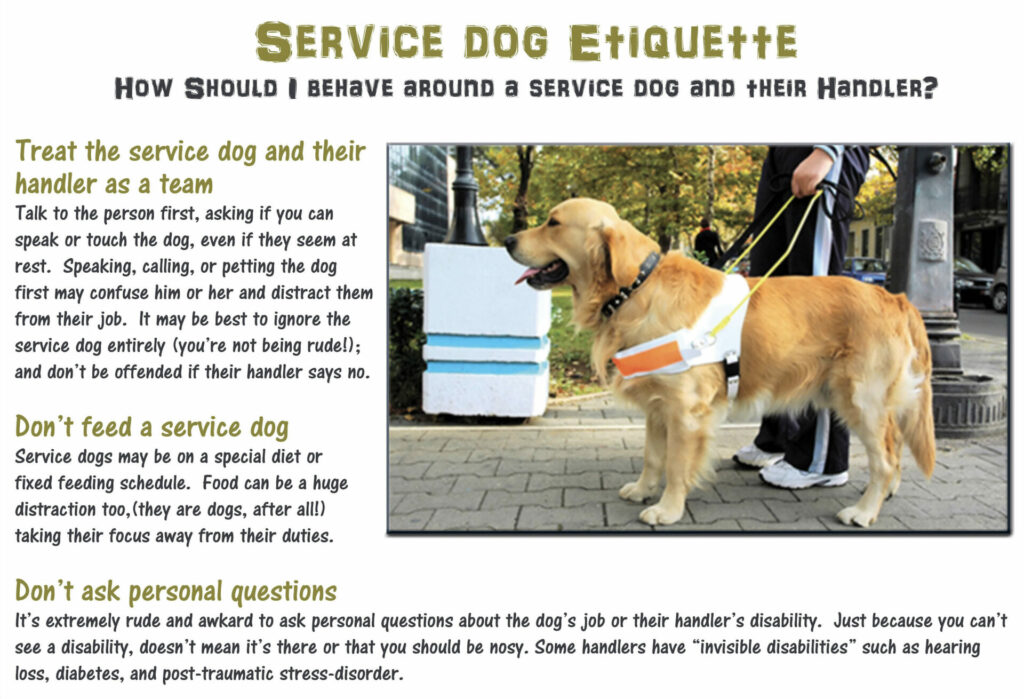 • Service animals are not required to wear a vest, patch or special harness identifying them as a service animal.