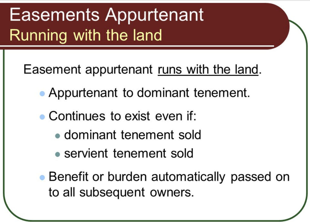 An appurtenant easement involves at least two properties and describes the rights of one property, which may be legally referred to as the “dominant estate,” over another property, referred to as the “servient estate.” Appurtenant easements will generally “run with the land” meaning that subsequent owners of the properties affected by the easement will be benefited and burdened by it, respectively.