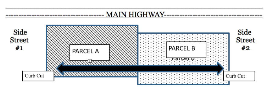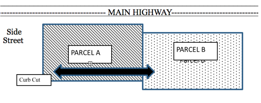 An Access Easement is an appurtenant easement. To illustrate, consider a “Parcel A” commercial property, which is located on the corner of a busy highway and side street, and “Parcel B”, a second commercial property located off the busy highway. Parcel B wants access for its customers off of both the main highway and the side street, so Parcel B may negotiate an access easement with Parcel A, under the terms of which Parcel B may use a certain portion of Parcel A’s property (depicted below with arrows) and Parcel A’s curb cut to the side street, all for the limited purpose of accessing the Parcel B property. In this scenario, Parcel A is the servient estate, and Parcel B is the dominant estate. Future owners of Parcel B will continue to have the rights over Parcel A’s property because the easement runs with the land.