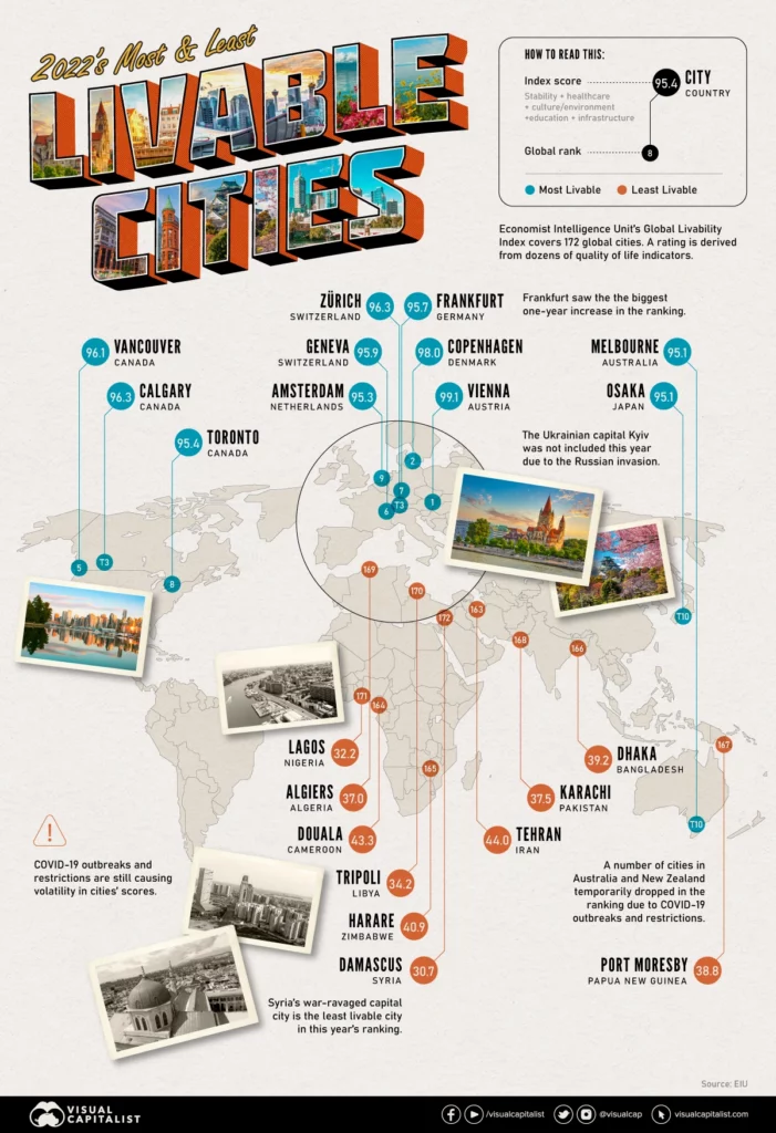 Pandemic restrictions changed the livability of many urban centers worldwide as cultural sites were shuttered, restaurant dining was restricted, and local economies faced the consequences. But as cities worldwide return to the status quo, many of these urban centers have become desirable places to live yet again. This map uses annual rankings from the Economist Intelligence Unit (EIU) to show the world’s most livable cities, measuring different categories including: stability, healthcare, culture and environment, education, and infrastructure.