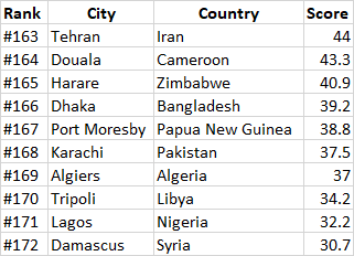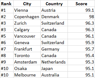 The ranking attempts to assess which cities across the globe provide the best living conditions, by assigning a score on 30 quantitative and qualitative measures across the five categories with the following weightings: 1) Healthcare (20%); 2) Culture & Environment (25%); 3) Stability (25%); 4) Education (10%); 5) Infrastructure (20%) Of the 30 factors within these categories, the qualitative ones are assigned as acceptable, tolerable, uncomfortable, undesirable, or intolerable by a team of expert analysts. Quantitative measures are given a score based on several external data points. Everything is then weighted to provide a score between 1-100, with 100 being the ideal.