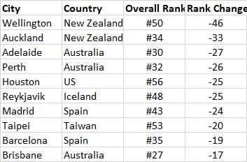 Some cities in New Zealand and Australia temporarily dropped in the ranking due to COVID-19 restrictions. Also, some Eastern European cities moved down in the rankings because of their close proximity to the war in Ukraine. Kyiv was not included in this year’s report because of the conflict.