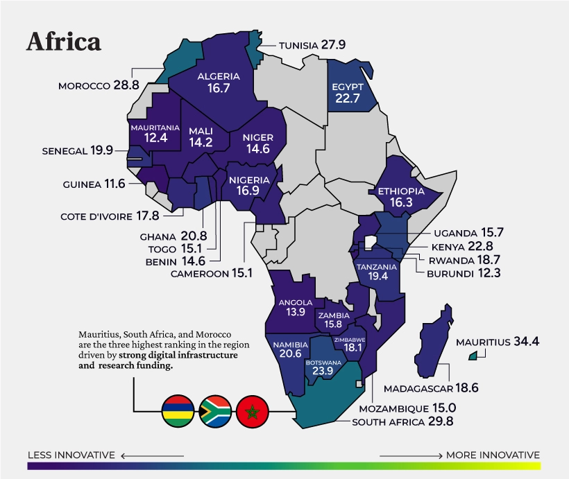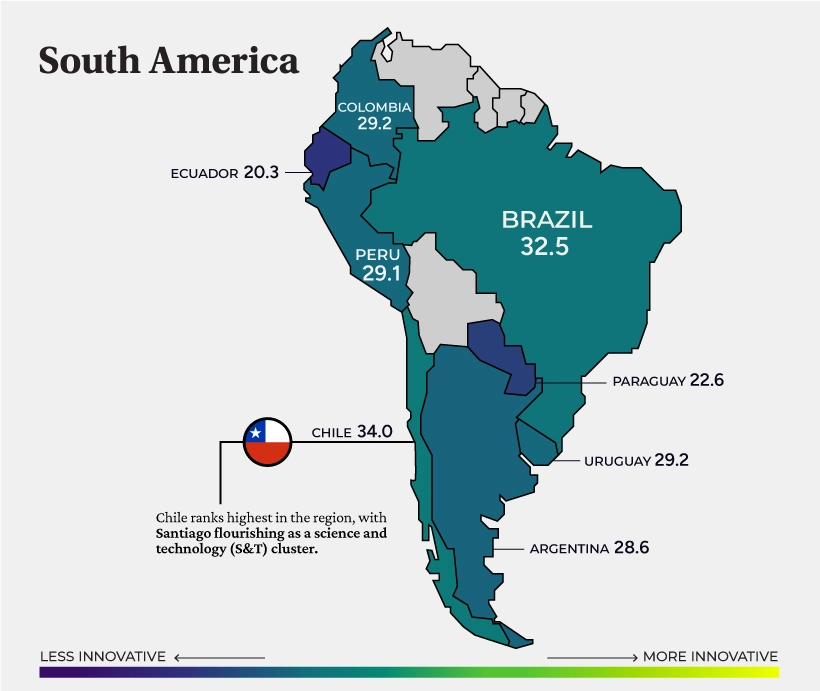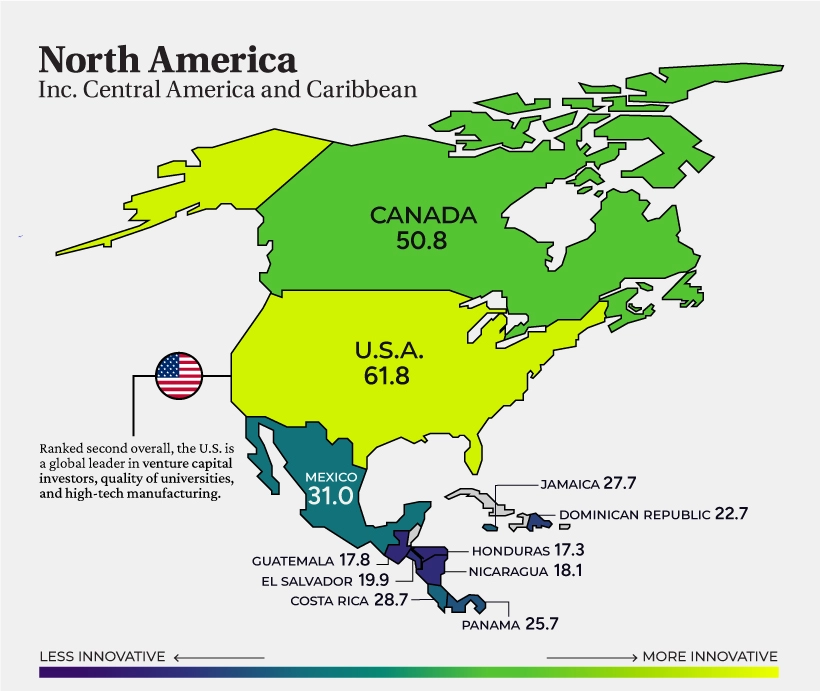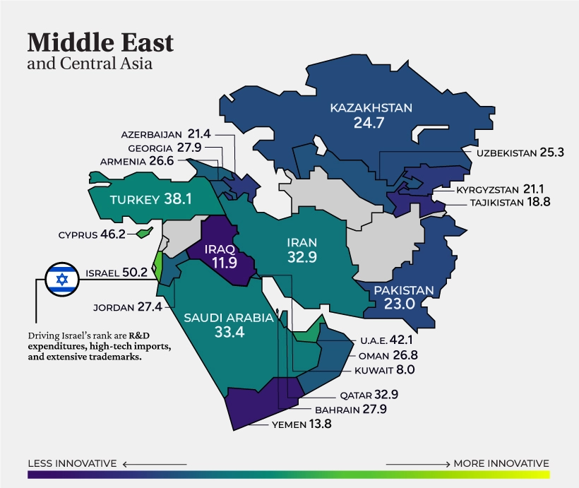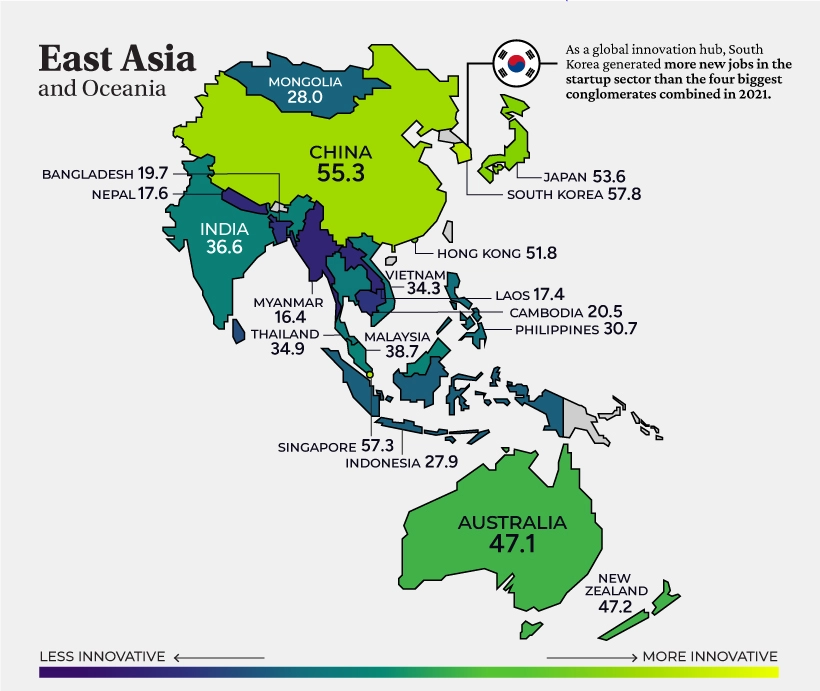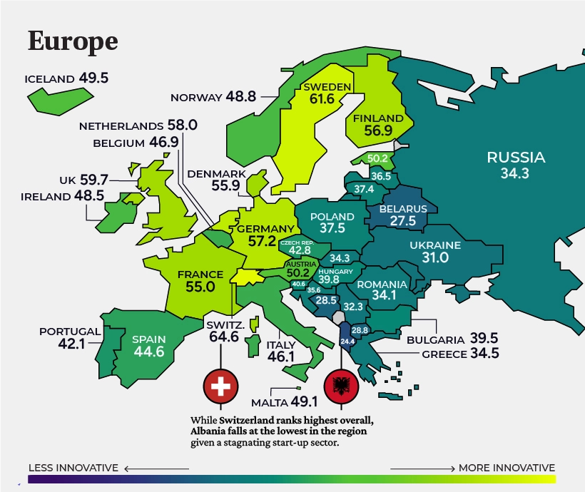 The infographic on the opposite page ranks the world’s most innovative economies using data from the UN’s WIPO Global Innovation Index. The framework used for the index was designed to create a more complete analysis, comprised of 81 indicators across seven categories to calculate a country’s score. Those categories were: Business Sophistication, Market Sophistication, Infrastructure, Human Capital & Research, Institutions, Creative Outputs, and Knowledge & Technology Outputs. Research specifications and additional graphics are available HERE. Below you can view enlargements by region of the graphic on the opposite page.