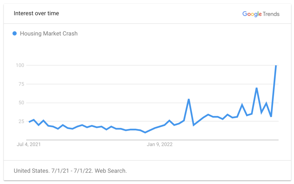 And it’s no wonder that a correction is on many of our minds. Recent rate hikes from the Fed, alongside pullbacks in prices and an increase in inventory nationally, have left many Americans wondering if a housing crash is imminent. While we’ll leave the prognostication to the economists, it is true that sentiment and price frequently feed off one another momentum. As such, it can be interesting to get a snapshot of what secret fears (or hopes) are revealed by our collective Google search history. In June, Google Search volume for the phrase “Housing Market Crash” was up roughly 300%.