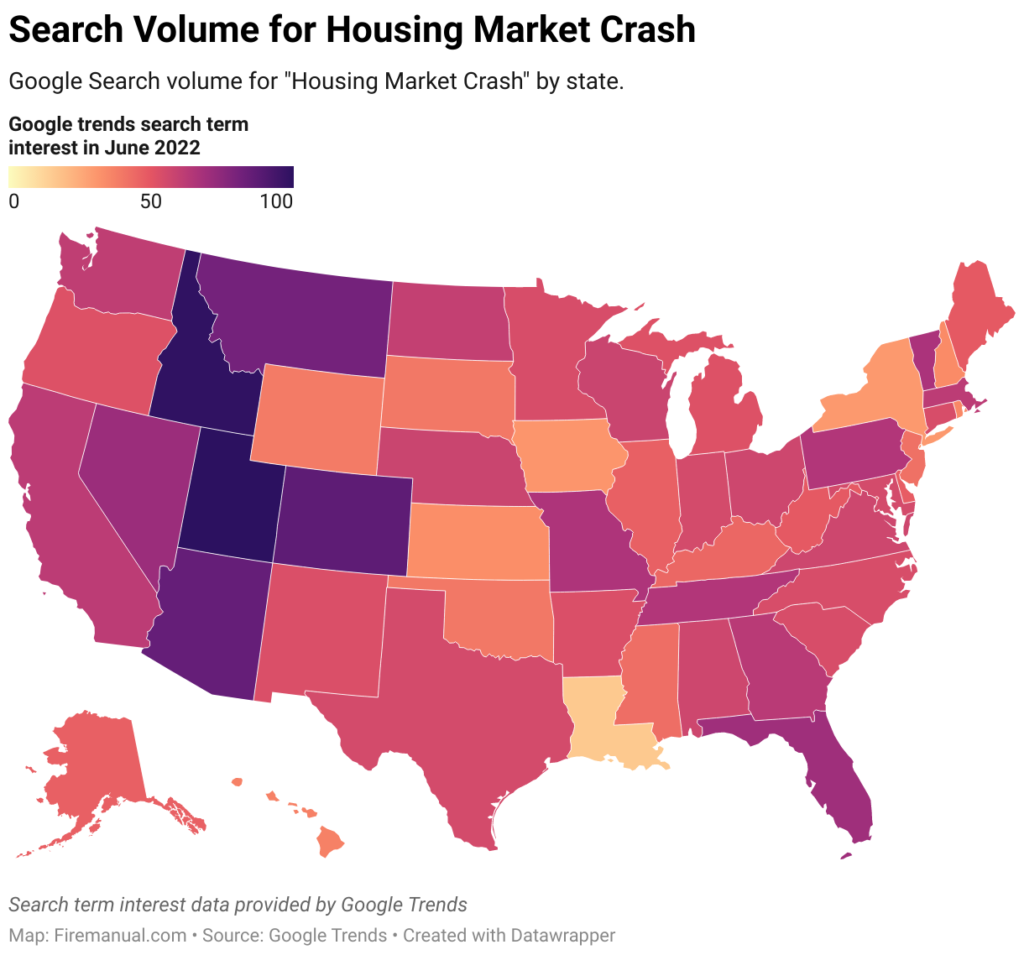 This increase in search volume was not equally distributed. Those states most fervently looking to Google for signs of a real estate crash were, unsurprisingly, in those newly unaffordable housing markets across the Intermountain West.