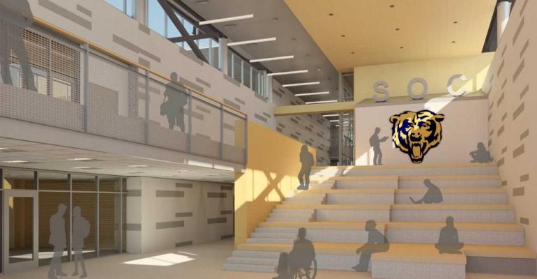 South Oak Cliff High School was graced with two wonderful internal courtyards that provided natural light and limited access to certain classes or grade levels. We repurposed those courtyards and created the new main entry to align with a view into the green space. We opened up each corner of the courtyards providing access for outdoor experiential learning and overlooks from the 2nd floor from the new collaboration spaces. One courtyard will have an amphitheater and stage while the other will serve as social gathering spaces for all grade levels. Each will be accessible to the educators for outdoor learning. A new 2 ½ story student entry named the ‘Bear Den’ is immediately adjacent to an outdoor newly designed and created pocket park on the school property celebrating the arrival of the students each morning, setting the tone for their Health + Happiness in the new SOC when it opens in August of 2020. (Picture 7)