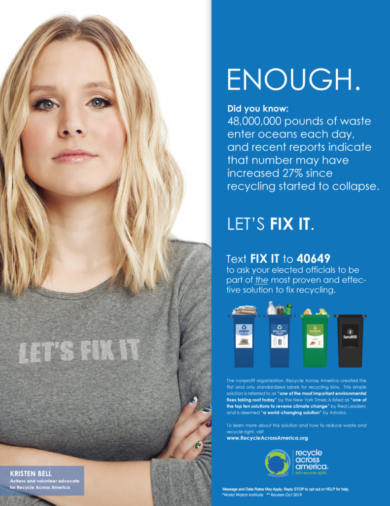 campaign to help people recycle right and to introduce this solution. Our network publication has been displaying their Let’s Recycle RightTM public service campaign for a few years, which features the images of Kristen Bell, Angie Harmon, Johnny Galecki and other prominent volunteers.