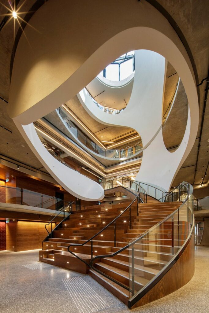 Located in Melbourne, the Victorian Pride Centre is Australia’s first purpose-built center for LGBTQ+ communities. Designed by Brearley Architects and Urbanists and Grant Amon Architects, the five-story building resembles a collection of tubes in a stacked formation that grow taller as it moves further from the street. Circular cutouts punctuate the façade revealing layers of concrete beneath.