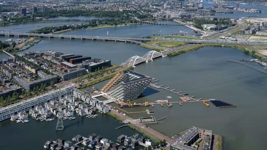 Quick Summary Audio Built on an artificial island in the IJ lake in Amsterdam, Dutch studio Barcode Architects and Danish architecture studio BIG have completed the angular Sluishuis housing block. It surrounds an internal harbor with a double cantilever that forms a gateway from